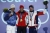 フラワーセレモーに参加するメダリスト達。左から銀メダルの長島圭一郎、金メダルのモ・テボン(韓国)、銅メダルの加藤条治・15日、スライディングセンター